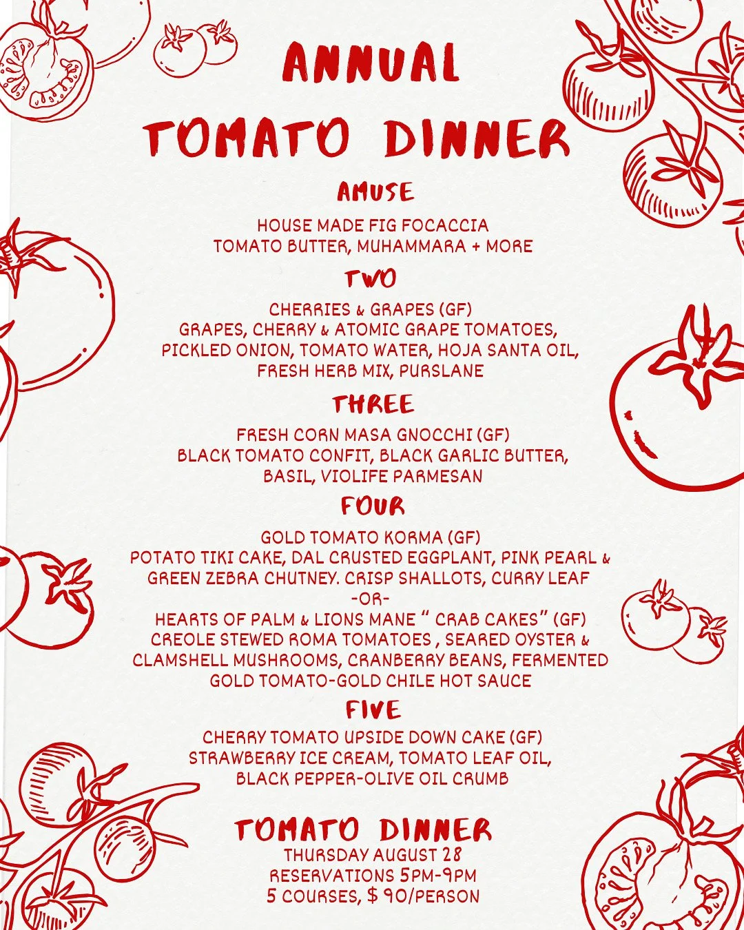 Join us Thursday, August 28 for our beloved Annual Heirloom Tomato & Farmers' Market Dinner-five vibrant courses celebrating the height of Bay Area summer. From peak-season tomatoes freshly picked by our very own team earlier in the week at Eatwell Farm to ingredients from the local growers who inspire our menu year-round, Chef Eric and team will craft a feast that honors our farmers and the flavors of the season.